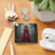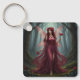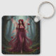 Una hermosa hada con un vestido rojo que fluye y un collar y un cinturón hechos de avispones con claveles y avispas en su largo cabello rojo oscuro y sus alas con forma de libélula roja que sostienen un clavel rojo en cada mano camina a través de un mágico bosque rodeado de luciérnagas, flores y moscosos árboles cubiertos de viñas.
