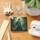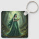Una hermosa hada con un vestido verde que fluye y un collar hecho de esmeraldas con pétalos de lirio-del-valle en su largo cabello verde esmeralda y sus alas de libélula verde claro e iridiscente sosteniendo un lirio-del-valle en un mágico bosque rodeado de flores azules y amarillas, lirios-del-valle y árboles cubiertos de musgo.