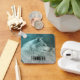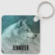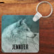Cadena de llaves personalizada con una fotografía de un guapo peludo y esponjoso lobo gris. En el fondo hay un bosque oscuro con árboles. Vibra mística mágica.