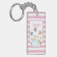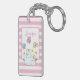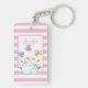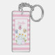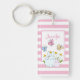 Cadena de teclas acrílicas con fondo rayado rosa y blanco. Un marco blanco con un borde rosa sobre el techo con tu nombre personalizado dentro. Dentro del marco hay un ilustracion con una madre y un conejito de bebés juntos. Las margaritas amarillas en el fondo. Unas mariposas extravagantes revoloteando por ahí.