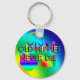Diseño gráfico de un símbolo de paz hippie con el texto "Los viejos hippies nunca mueren" del artista/diseñador Charmaine Paulson en una cadena de claves.