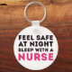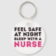 Siéntete a salvo de noche, duerme con una enfermera Una enfermera linda, fresca y divertida que dice una cita en un texto rosado y negro.