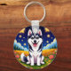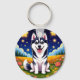 Obra de arte colorida y vívida que representa a un husky siberiano feliz bajo un cielo mágico y estrellado al atardecer en medio de flores floreciendo en una pradera serena, mostrando una armonía caprichosa entre la naturaleza y la alegría.