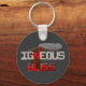 Este keychain de humor geológico presenta el juego de palabras "Igneous is Bliss", un giro geológico en la frase común "Ignorancia es Bliss." La imagen representa un sistema igneoso, con las letras dibujadas como roca gris y rojo, magma con aguijón que cubre cristales bajo un volcán activo y en erupción.