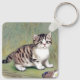 Cadena de llaves con un gatito a rayas. Hay rayas negras que cruzan la piel de un gatito blanco. Una flor blanca decora una cesta en un campo de hierba. ¡Un regalo fantástico para los amantes del gato y del arte victoriano!