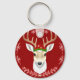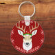 Ilustracion de un reno alegre vestido con un gorra festivo, rodeado de decoraciones de copas de nieve en un fondo rojo, creando un alegre y festivo tema de vacaciones.