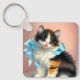 Keychain con un lindo gatito de calico. El gatito lleva una cinta azul mientras se sienta adorablemente sobre una mesa. Un regalo perfecto para los amantes del gato y del arte victoriano.