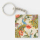 Postal de ilustraciones de pavo real y cachorros. Patrón colorido vintage con pavos reales azules y adornos rojos y morados.