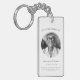 Simple elegant prayer keychain for a loved one's memorial and funeral service. The front features "In Loving Memory Of" and "forever in our hearts" in a mix of typography and script. Personalize with their photo, name and birth and death dates. The reverse side features a long inspirational passage ("Fill Not Your Hearts With Pain") and a shorter message, or customize with your own. a lovely little keepsake for friends and family to treasure forever