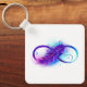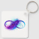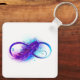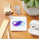 Símbolo infinito con una hermosa pluma pintada de color violeta y azul brillante sobre fondo blanco.