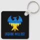 Un inspirador diseño de la cadena de claves que hace eco de la resiliencia del pueblo ucraniano, presenta una silueta de pájaro fénix en los colores azul y amarillo de la bandera de Ucrania con el texto "Ucrania se levantará" en un fuente angustiada sobre fondo negro