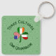 The flags of Italy, Ireland, and United States of America (USA) are found in the leaves of this shamrock, designed to celebrate St. Patrick's Day, 4th of July, and Italian holidays. It sits on a background of light green squiggly squares. Above are the words THREE CULTURES. Below, ONE YOURNAME. Words are in dark green, Celtic style, circular letters. Add your name in the appropriate place for a personalized look. Need a customized gift? Just add someone else's name.
