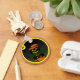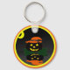 Esta es una imagen de una linterna Jack O vestida. Una calabaza negra con un gorra de brujas naranja está sentada sobre una cama de hojas verdes. El Jack o Lantern está iluminado con ojos brillantes y una sonrisa. Se añadió un fondo negro para que puedan ver su reflexión. Las cadenas de claves están disponibles en varios estilos y tamaños.