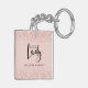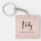 Llavero personalizado Boss Lady Rose Gold Blush Rosa Brillo -- un regalo preciado para una empresaria jefa. Si una mujer en tu vida posee un negocio, aquí tienes un regalo considerado para las fiestas, cumpleaños, día de la madre o aniversario empresarial... un llavero personalizado con su nombre debajo de un gráfico artístico del logotipo de Boss Lady. Sobre un delicado fondo rosa blush, nuestro llavero único presenta capas de brillo blush arriba y abajo para añadir destellos. Puedes revisar fácilmente el texto del nombre de ejemplo utilizando la plantilla de personalización.