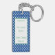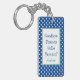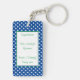 Una graciosa cadena de claves de retiro con un diseño de puntos de polka blanco en un fondo azul oscuro con una gran caja de texto con fronteras azul y verde y la cita "Tensión de adiós, pensión de hola". hace un encantador regalo humorístico para un empleado, compañero de trabajo, familia y amigos que se están jubilando. Todo el texto se puede modificar a personalizar y luego personalizar con un nombre, y en la parte posterior un mensaje y un negocio/ empresa o nombre de los que hacen el regalo. Todos los colores se pueden modificar si es necesario ir para personalizar más el botón.