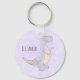 Una cadena de llaves con un bonito ilustracion con un dinosaurio morado grisáceo.