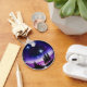 Esta fascinante obra de arte digital resume el vasto cielo estrellado en un mundo circular perfecto. La pieza está dominada por gradientes azules y violetas, creando una noche tranquila y misteriosa. Varios estallidos radiantes purpurinas en el firmamento como si fueran iluminados por la magia. Debajo, los pinos de silueta y un horizonte morado evocan la atmósfera de ensueño de un invierno frío o del extremo norte. Este diseño está impregnado de fantasía, romanticismo y festividad, por lo que resulta ideal para transmitir buenos deseos, una decoración de ensueño o un diseño de regalo único. Su composición circular y su paisaje distintivo aportan un efecto visual único y cautivador a cualquier producto.