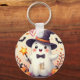 Añade un toque de dulzura espeluznante a tu Halloween con esta encantadora cadena de claves que presenta a un simpático fantasma vestido con un gorra de brujas y corbata de arco, sosteniendo una varita mágica. Rodeado de calabazas, murciélagos, hojas de otoño y un pequeño compañero de esqueleto, este diseño caprichoso es perfecto como regalo.