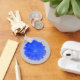 Este keychain de bonito muestra una fotografía de una flor de marigold que ha sido manipulada para convertirla en un impresionante color azul brillante. La flor se sienta sobre un fondo gris.