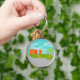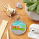 Esta Moderna casa Personalizado de mediados de siglo Round Keychain le hará desear sacar la alfombra de BIENVENIDA y sentirse como en casa. El diseño artístico minimalista de los años 60 se compone de una elegante casa de piedra naranja y de cristal acuático sobre un frondoso césped verde en forma de boomerang. El césped forma un oasis en medio de su entorno gris y de hormigón. Una palmera verde se balancea en la brisa. Cuatro escalones de piedras naranjas conducen a la puerta trasera, roja y retro, con tres cristaleras rectangulares. A la izquierda de la puerta, una maceta de flores turquesa acoge una planta tropical verde. La casa tiene un techo blanco inclinado en forma de V que apunta hacia dos nubes blancas con forma de riñón. El cielo es una sombra positiva de agua. ¡Nadie querrá tirar piedras de esta moderna casa de cristal! ¡Compra este producto kitschy de la edad espacial y sé el gato más genial de tu bloque!