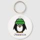 Keychain de nombres personalizados para los amantes de los pingüinos. Gracioso personalizado de pingüino de invierno. Diseño animal lindo con gorra verde puesto. Un regalo de cumpleaños divertido para los niños.
