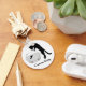 Silhouette de un curioso gato mirando a un tazón de pescado mientras el pez mira hacia atrás.
