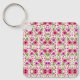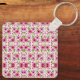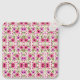 Keychain featuring a repetitive pink floral pattern with green leaves on a white background. The design is vibrant, cheerful, and eye-catching.