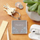 Keychain floral premium floral de mariposa dulce y delgada con un fondo gris polvoriento y turbio, mariposas azules claras y adornos de viñas florales. Este elegante fob con llave floral es una encantadora elección para mantener las llaves a mano con un toque de circunferencia. Fácil de personalizar, simplemente agregue el texto personalizado de su elección en los campos de texto proporcionados. Haga clic en el botón "Personalizar" para encontrar opciones de personalización adicionales.