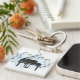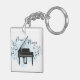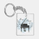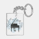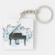 Una cadena de claves para los que les encanta tocar el piano, regalos para profesores de música y pianistas. El diseño del keychain es un piano negro con notas musicales flotando alrededor de él sobre un fondo de color azul.