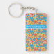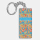 ¡Nunca pierdas las llaves otra vez! Añade tu número de teléfono o nombre a esta Keychain acrílica cuadrada de bonito, con un patrón de flores naranjas, rojas y amarillas en un fondo azul turquesa; de un collage de papel pintado a mano de Judy Adamson.