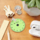 Números de la cara de reloj marcados en segmentos de minuto. Las "manos" del reloj amarillo se fijan a las 6:15. El texto dice "Yo tiempo". Se puede personalizar el fondo verde claro.