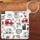 A playful, cartoon-style city pattern featuring buses, cars, helicopters, traffic lights, buildings, and fun doodle text like “Beep Beep,” “Wuz Up?” and “Go,” in bright red, yellow, blue, and black tones.