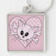 Calavera de gatito rosa y huesos cruzados sobre un corazón con estampado rosa.