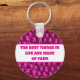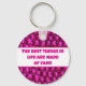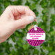 Hágale saber al mundo de tu amor por el hilo con esta llavera con hilo de punto rosa brillante junto con "Lo mejor de la vida es hecho de yarn". La parte posterior muestra el mismo patrón de punto rosado Original Photo - C. McGouldrick