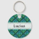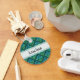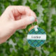 Una cadena de llave redonda de un nudo celta azul-verde repetida diseño de mosaicos de diamante contra un fondo negro con el nombre de personalizable en el medio.