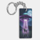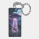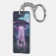 Escena misteriosa de un OVNI levantando una vaca en un rayo de luz contra el telón de fondo de un cielo nocturno con luna llena. Ilustracion perfecto para los aficionados a la ciencia ficción, y fantásticas historias sobre contacto con civilizaciones extraterrestres.