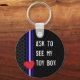 Muestra tu orgullo de cuero con este divertido llavero. Mostrando los colores de la bandera del orgullo de cuero este botón de la tecla dice "Pide ver mi caja de juguete" y se puede personalizar para decir lo que quieras. Hace un gran regalo para un compañero de cuero, señor, papi, niño o mamá'am o chica.