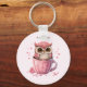 Una cadena de llaves con una imagen adorable de un búho sentado en una taza de café. Los corazones se cercan y un solo rosa se coloca en la parte inferior de la taza.