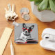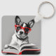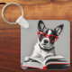 Imagen en blanco y negro de un perro Leyendo una lectura con un toque de color de marco de vidrio rojo una portada de libro