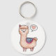Cuidada pintura acuarela de una llama tan caprichosa con un tejido con motivos multicolores en la espalda. A la derecha hay una burbuja de habla con un lindo corazón rosado dentro.