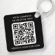 Cadena de teclas de doble cara con el logotipo de su personalizado, código QR y texto personalizado en un fondo de color negro o personalizado. Cambiar fuentes y colores de fuente, mover y cambiar el tamaño de los elementos con la herramienta de diseño.