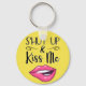 Esta cadena de teclas "Besame mi moda" presenta un dibujo de un par de labios de lápiz labial magenta y el título "Cállate y béame" con una letra negra moderna sobre un fondo amarillo brillante.