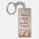 Cadena de llaves acrílicas con madera como fondo con el dicho "Créate en ti mismo", un hermoso recordatorio de lo que puedes lograr cuando crees en ti mismo!