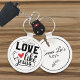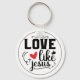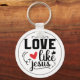 Religious typography "Love Like Jesus" with a red heart, and curled lines, scroll work, with a round black border. Customizable name on the back.