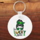 Esta es una cadena de claves divertida para celebrar el Día de San Patricio con un diseño que presenta a una mujer con el pelo en un moño usando gafas de sol y las palabras "Una Lásica Suerte".