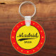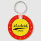 Insignia de Madrid con bandera de España de colores, forma redondeada. Emblema de diseño de Madrid. Sello de Madrid España.