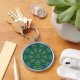 Este llavero mágico, misterioso, místico ofrece un modelo abstracto circular tridimensional brillante coloreado de curvas y de círculos caleidoscópicos en verde, azul, oro, turquesa y amarillo.