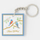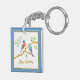 En una rama delgada debajo de flores rosadas de primavera, dos pájaros azules se sientan juntos. El pájaro macho es llamativo y vívido, sus plumas ricas en color: plumaje vibrante y azul profundo en la cabeza, espalda, alas y cola, contrastado por un rico color castaño o rojo ladrillo en la garganta y el pecho. Su vientre es blanco.