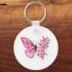 Arreglo floral de mariposa rosa con flores japonesas de cerezo rosadas sobre fondo blanco.