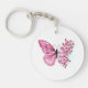 Arreglo floral de mariposa rosa con flores japonesas de cerezo rosadas sobre fondo blanco.